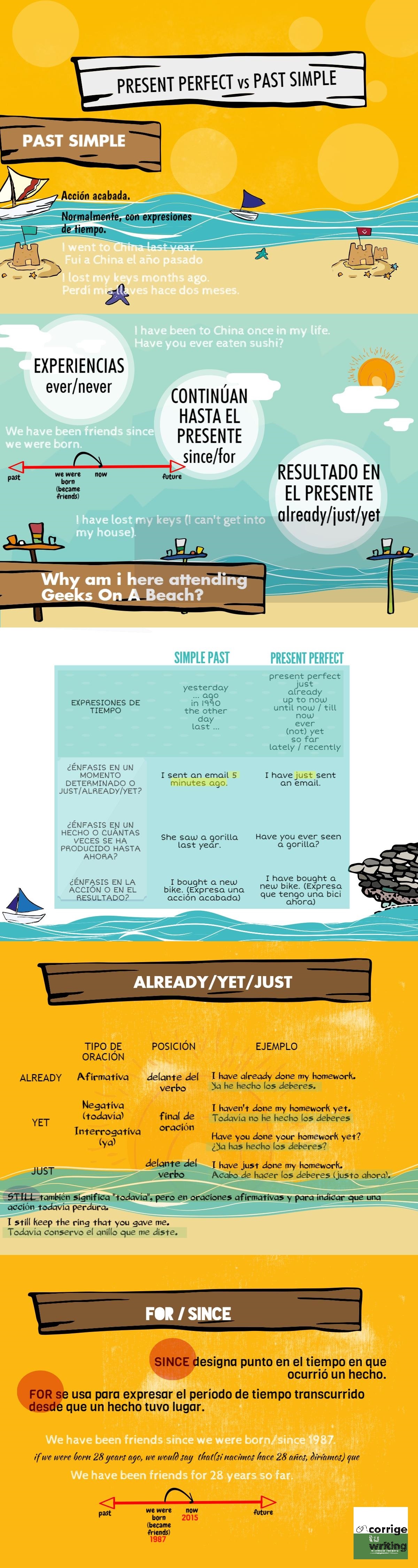 En la siguiente infografía se deja clara la diferencia de uso entre ambos tiempos y la manera de utilizar los adverbios en present perfect de manera